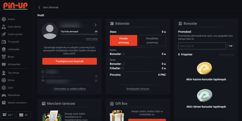 PinUp şəxsi kabinetində aşağıdakı funksiyalar mövcuddur: